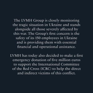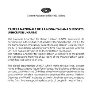 Якщо ембарго на експорт продукції світової fashion-спільноти до росії залишається відкритим питанням, то вже з березня 2022 року представники світової моди, окрім висловлювань підтримки українському народу, приєднуються до надання гуманітарної допомоги. Серед компаній і організацій, які на початку березня заявили про матеріальну підтримку Управлінню Верховного комісара ООН у справах біженців, – Kering, Chanel, Valentino, Armani, MaxMara, Prada, Французька федерація кутюр’є (La Fédération de la Haute Couture et de la Mode), Національна палата італійської моди (The Camera Nazionale della Moda Italiana). До World Food Program приєдналися Balenciaga, Versace. Пожертву в розмірі 5 млн євро Міжнародному Комітету Червоного Хреста надала компанія LVMH. Материнська компанія Danaher Інституту кольору Pantone у відповідь на гуманітарну кризу в Україні вирішила передати пожертвування в розмірі 1 млн дол. фандрейзинговій онлайн-платформі Globalgiving, міжнародній гуманітарній організації Save Тhe Сhildren, Міжнародному комітету порятунку The International Rescue Committee для допомоги українським біженцям.