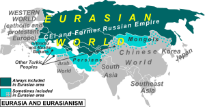 Євразійство – геополітичне та соціально-філософське вчення, що стверджує про особливу роль росії в світовій історії та потребу в об’єднанні під російською владою великої частини Євразії на підставі «історико-культурної спільності» народів, які її населяють. За цим вченням всі народи, що населяють Європу та Азію, подібні до росіян і тому можуть об’єднатися з ними в одну державу. Сучасна завойовницька політика рф базується на євразійстві.